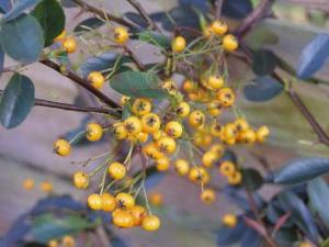 These little jewels have been cheering up my garden since last autumn. Pyracantha can be the only really bright colour shining through the dull months of winter, and they’re all the more welcome for that. The birds have snaffled the red and orange berries already – I have P. ‘Saphyr Orange’ and P. ‘Saphyr Rouge’ planted along the same fence, and they’re meant to mix ‘n’ mingle, but the yellow is all that’s left. No complaints here, though – I’m just grateful to have such a dainty little sprinkling of colour at this time of year.