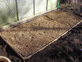 I roughly levelled out the earth inside the boards, and then put down some weed-suppressing membrane, stapled to the boards on the inside to about 1/2″ from the top (you can just about see the edges in the picture). And, finishing touch, about 9 bags of gravel from the local DIY store. This means you can level it easily, and the coldframe isn’t resting on bare earth – which means it won’t rot so quickly, either.
