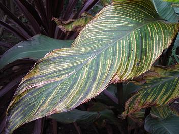 Now I’m not a canna expert but I’d say this was a virus. I was talking to the nice man at Hart Cannas earlier this year for an article, and he tells me virus is rife in the canna industry – in fact it’s got so bad that it’s far more likely that a canna you buy will have a virus than not. Apparently it’s all because a shipment of cannas to the UK from the Netherlands was riddled with it, and it’s spread like wildfire ever since. At Hart Cannas they’re actually starting again from scratch, breeding their own virus-free stock: they don’t have a lot yet, but it’s building up and I think may soon be the only refuge for those who like their cannas without horrible streaks, mottlings and leaf puckerings.