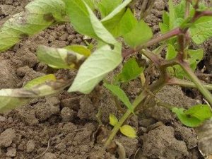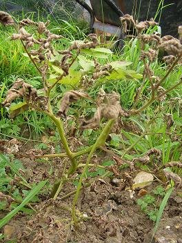 Finally the poor potato plant ends up looking something like this – every leaf shrivelled, every stem brown and sick-looking. You shouldn’t let things get to this stage: when you first see the leaf-spots, remove the foliage completely, as rain will wash the fungal spores down through the soil and onto your potatoes otherwise (and you’ve never smelled anything bad until you’ve smelled a blighty potato).