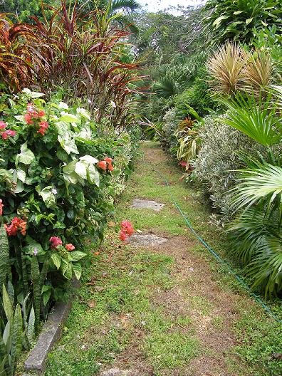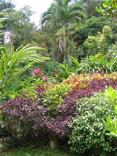 Another example of Victoria’s fine planting sense: bougainvillea, crotons, and that’s a juvenile fishtail palm in front there.
