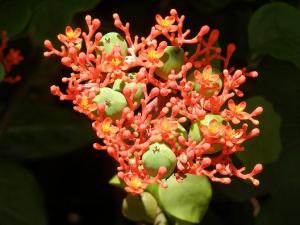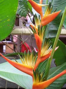 This was a beautifully flowery garden all round, in fact – just the right balance between foliage and blooms. Here it’s the heliconia – a flower so ubiquitous here as to be common. Nothing common about this: Victoria tells me it’s the variety ‘She’, and I was very taken with those oh-so-subtle green-tipped flowers. The bright orange bits are bracts – it’s the sticky-up bits which are the flowers (usually much smaller than in this variety). They’re pollinated by hummingbirds. Obviously.