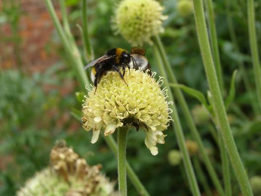 Bees were everywhere: here squeezing the last few drops of nectar from Anthemis tinctoria ‘Susan Mitchell’. I liked the way they left the heads on instead of dead-heading (my usual knee-jerk reaction to anthemis at the end of its season): they looked like palest yellow pincushions dancing in the breeze.