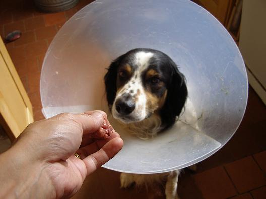 Real life indeed! Good for you capturing the moment so well. Look at the expression in your dog's eyes – wanting the mince and at the same time suspicious of what might be lurking inside it.It might amuse you to see another dog in a collar, in British Columbia, on my friend Miranda's blog:http://nurturedbylove.blogspot.com/2009/07/sad-yet-miraculous-story.htmland http://nurturedbylove.blogspot.com/2009/07/limpets-update.html