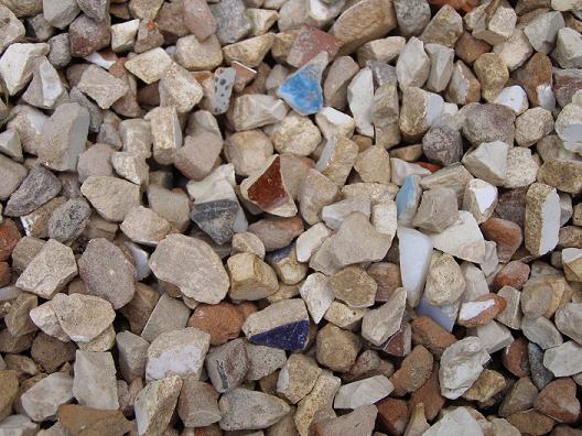 The stuff is full of little bits of coloured china. The kids are in heaven – they spent most of yesterday pulling out chips and washing them to make mosaics. And there’s more, though sadly, my powers of photography are not up to showing you. The best thing about our new gravel is that those glazed bits catch the sunlight (and car headlights at night) and glint like little stars on the path.