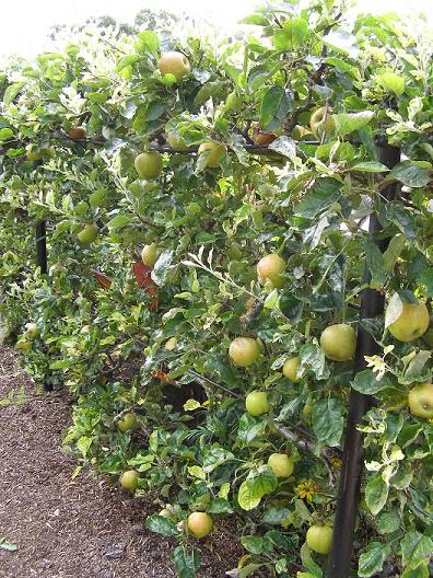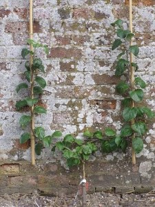 You can trim them into single stems – cordons – trimming off all the side shoots to encourage fruiting spurs from the main stem only. If you’ve heard of espaliers and fan-training, you’ve probably heard of cordons. The advantage to this is you get to pack about five varieties into a ten-foot space. You can grow cordons upright (though you get less fruit I believe) – like this: