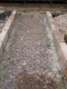 Back to the grindstone: you may remember I had a two-inch layer of MOT on the path which once I’d got the capricious and frankly malicious whacker plate under some semblance of control I managed to compress to a pretty good solid layer.