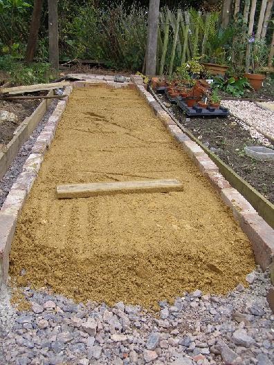 Step 8: it’s time to play with the sand you ordered, if the neighbour’s kids haven’t got there first. A 2″ layer inside the brick edging, if you please.