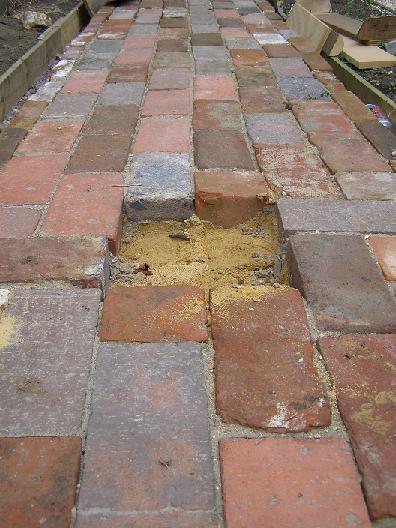 I have three holes in my path: here, where the four arms of the cross meet (there are two little side-paths off to my shed and my greenhouse – oh, no, I’m not over-ambitious, oooooh no) and at each end, where the squares I made under the gates in and out were, ahem, not exactly square.