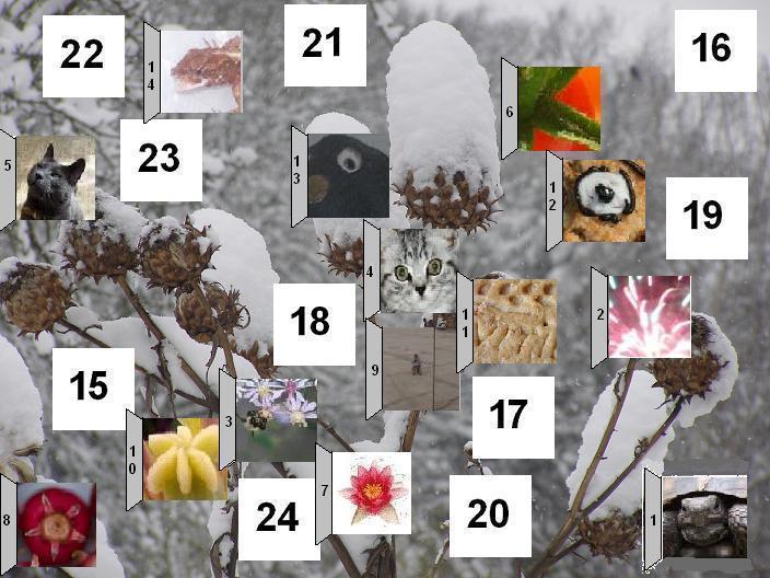 The 2009 Garden Bloggers’ Advent Calendar: December 14 14 Monday Dec 2009 Posted by sallynex in Uncategorized ≈ Leave a comment Tagsadvent calendar For rules, explanations and excuses see the original post here. Rate this:Share this: Click to share on X (Opens in new window) X Click to share on Facebook (Opens in new window) Facebook Like Loading... Related
