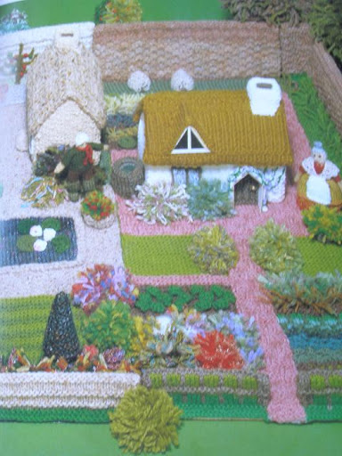 Apologies for the photographs here – they’re just pics of the book – but I got very carried away by these. This one on the left is a cottage garden – it’s actually a wall hanging and this is just one section of it. The row of cottages with their knitted roofs and crocheted conifers and the perfect pathways are just so gorgeous.