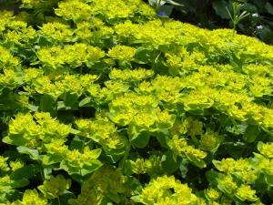 Then finally, when it reaches a neat and tidy naturally domed shape of such perfect uniformity that nobody believes I don’t clip it, and just when the tulips are going over and you’re starting to want something else to look at, the acid yellow flowers appear – in reality, of course, bracts that attract attention to the inconspicuous true flowers in the centre. They are of a brilliant purity that reminds you of the sun even when there isn’t any in the sky: and when there is, they glow with a luminescence of sunshiny joy that they make me smile every time I look at them.