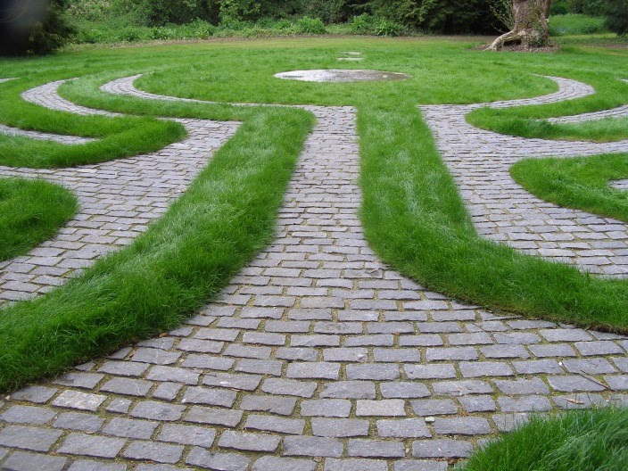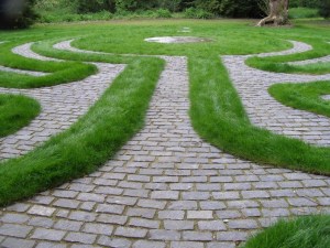 There are a handful of surviving ancient miz-mazes in the country: one near Fordingbridge, in Hampshire, and another on a hill fort somewhere near Winchester. Apparently in the really old ones – made entirely of turf with no hard-landscaped paths – the passage of feet wore the pattern of the labyrinth more deeply and indelibly in to the ground.