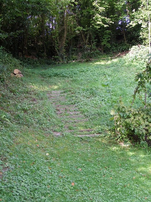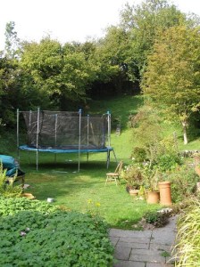 By this I mean the back half of the back garden, which slopes gently upwards towards the footpath between it and what we call the top field. In this photo you’ll have to avert your eyes from the large blue monstrosity in the middle: essential for keeping small children distracted, but a total eyesore. We have ambitious plans which involve terracing a bit just in front of the hill so we can move it back and to the side, and well out of the way.