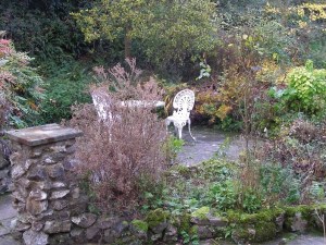 Turn your back to the house once again, and look to your left: this is the side of the garden that lies in the lee of a steeply-sloping bank, topped with a hedge, the lane meandering by on the other side a good ten feet or so above head height. The ‘lawn’ stretches back from here, but in front is a little seating area: no good for chilly autumn or spring, when you require the full force of the sun, but wonderful in summer, I suspect, where the shade will be a welcome respite from all those 40Β°-plus temperatures we’re supposed to be getting in a few years’ time.
