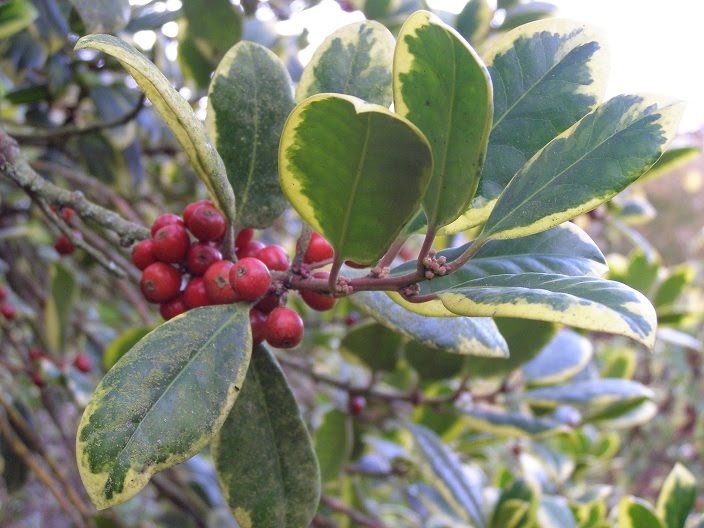 At the back is a fine variegated holly – it’s right next to the Ginkgo I mentioned in a previous rambling, and the contrast between the Ginkgo’s yellow autumn foliage and the yellow-and-green variegation of the holly is inspired. And it looks like we’ll have holly berries for Christmas for the first time ever this year.