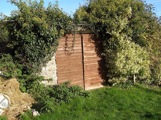 The log store, on the top terrace, is… well… less than edifying, and extremely overgrown. I may be commissioning my carpenter husband to do something deliciously gorgeous there instead. It has also, as you can see, been used as a compost heap by the previous lot of people, who kindly left their monster pile of garden rubbish for us to make use of – though I’m going to have to do a lot of shifting around into proper compost bins first.