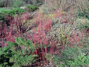 Bark is just one of the things unnoticed in summmer but showing its true beauty in winter: here a bank of dogwoods (there were silver birch behind, too)