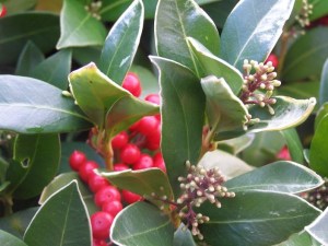 Berries and flowers on the same plant: Skimmia japonica worked its magic in great frothing heaps, making eyecatching splashes of colour