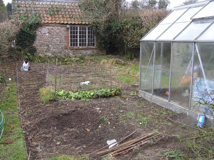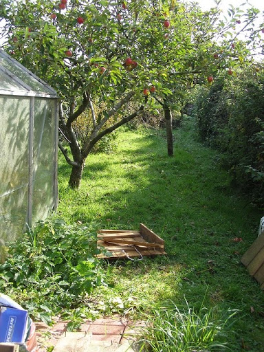 On the other side of the gate into this area is what’s going to be my fruit cage (-that-doesn’t-look-like-a-fruit-cage). Design plans still ongoing…. I’ve cleared the veg beds which were here when we came, and very nice the beetroot were too, and this area is now also home to a second greenhouse – relocated (with help from Paul Debois – who found time in between lugging sheets of rusty metal around to take a photo – and a very large rented van) from my old allotment in Surrey. The pit is there a) to capture unwary husbands helping to erect said greenhouse and b) originally as a shed base, but then I changed my mind and decided it would block the view too much. Oh yes, and I’ve been stripping acres of ivy plus not a few roof tiles off the single garage, which is now de facto my shed, having been wrenched with many protestations off my husband who rather fancied it as a wood store. My technique was a cunning mix of bribery and compromise: he needed somewhere to put his motorbike, I needed somewhere to put my potting bench. QED.