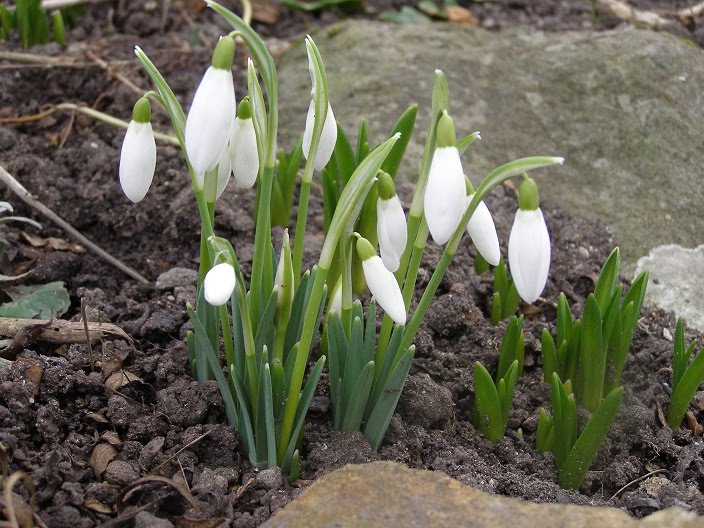 Popping up all over the place in the rock garden are my lovely snowdrops: now there’s a phrase I’ve never been able to use before. Condemned to a snowdrop-less existence because of the acid sand I used to garden on (kept meaning to buy Galanthus elwesii which can apparently cope with drier conditions but never quite got around to it) I now have the damp chalk and shade they relish. The garden is full of snowdrops, and my heart is just singing.