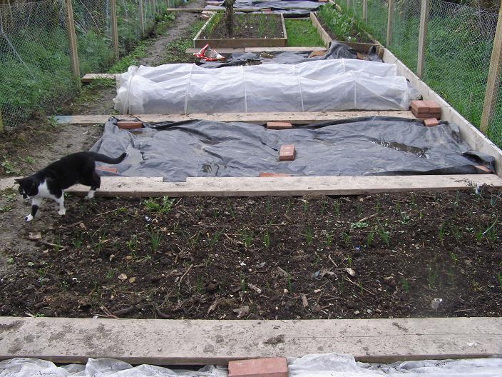 The far end is well up and away: with the addition of a bit of bought-in soil improver (not yet quite confident about how good my soil might be), new potatoes, onions and shallots have joined the overwintering broad beans and autumn-sown onions.
