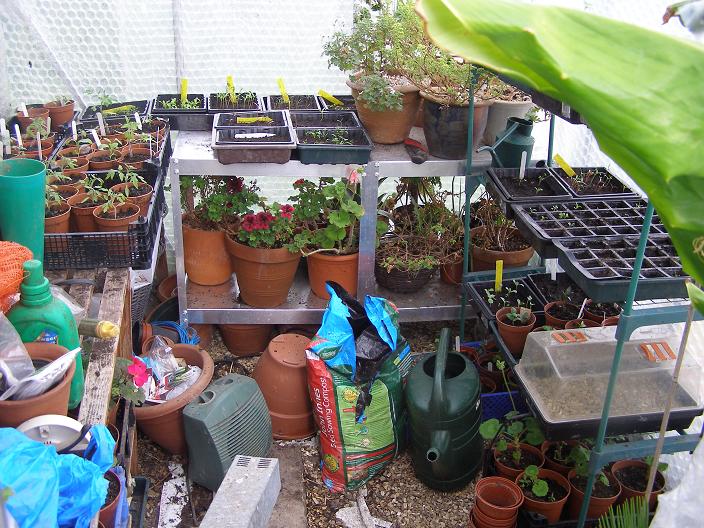 Greenhouse no. 1 – unheated – is filling up: the other day I had to rig up the coldframe (in bits since the post-move chaos) in a hurry to get the first of the sweetpeas, chard and overwintered marigolds ready to go out.