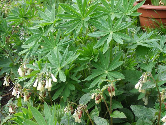 And other things are popping up here, too: lupins and a carpet of some kind of small white comfrey. It’s beautiful, the bees love it, but it is obviously a little invasive: I shall have to think carefully about where I move it to.