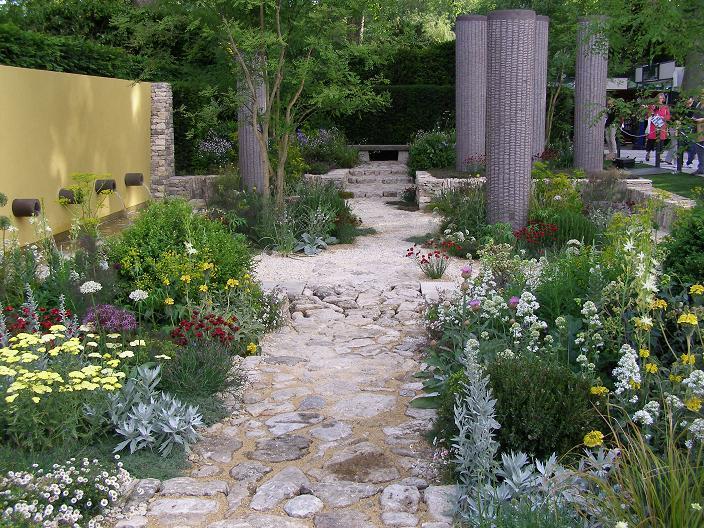 Cleve West’s garden for the Daily Telegraph: one of eight gold medal winners and also this year’s Best in Show. Dramatic sculpture, the most wonderful ochre-painted wall, cobbles, Sophora trees, artless, jewel-like planting…. oh, I love this garden!So much so that I’ve got another postcard today too – here’s a closer look at that planting.