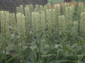 Eucomis pallida: thick, upright spires of cream over strappy green leaves, tall and imposing