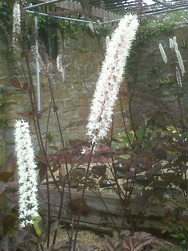 Actaea simplex ‘Brunette’: spires of dreamy white over deeply-toothed leaves of deepest purple.