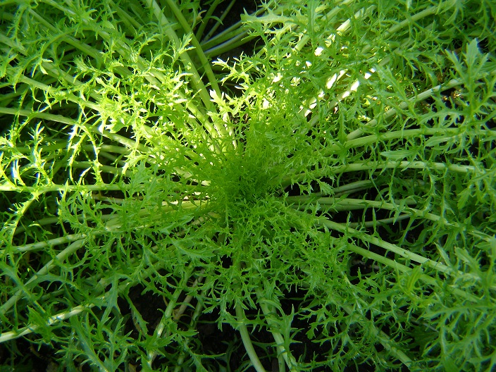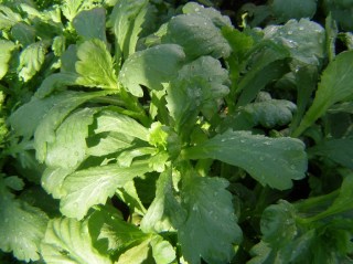 Shungiku: leaves like chrysanthemums: not surprising, really, as that’s what they are. Its other name is chrysanthemum greens (chop suey greens is another alter ego). Sarah Raven describes the flavour as ‘strange, fragrant, slightly sweet and slightly peppery, with a good crunch’. You can eat leaves, the tight yellow flowerbuds and flowers – though petals only, not the bitter centres.