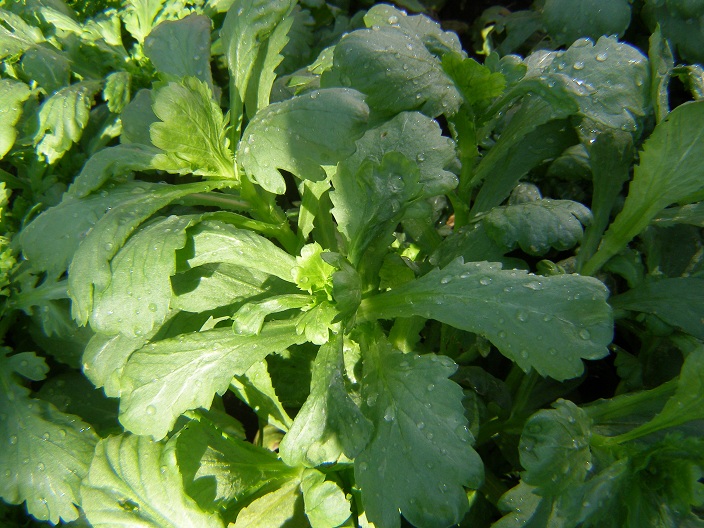 Mustard ‘Green-in-Snow’: brilliant green, serrated-edged leaves; and Mustard ‘Red Giant’: the only one I’ve grown, a familiar ingredient in salads with its reddish bronze tinted leaves. Both are getting towards the hotter end of the scale. According to Sue Stickland, ‘if you like watercress, you’ll love this’.