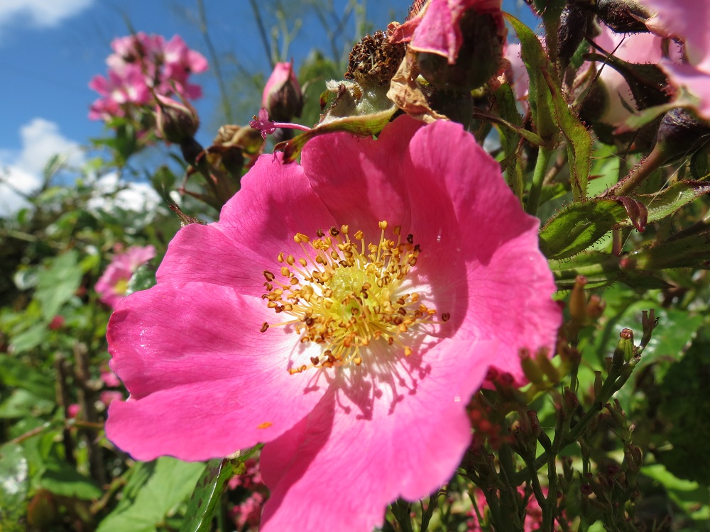 Rosa canina: not sure of the selection but it grows rampantly over my front wall and flowers furiously all summer long |
