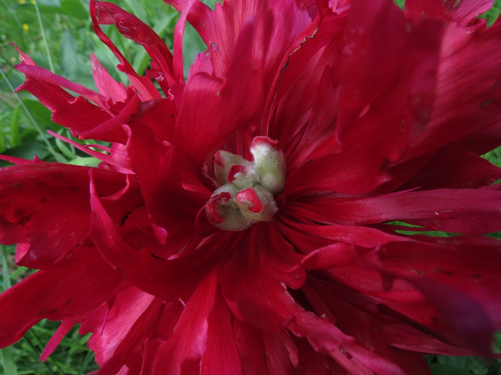 Paeonia officinalis, looking a bit louche and about to seed but I rather like them like this with their corsets loosened |