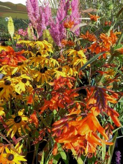 | Crocosmia x crocosmiiflora ‘Emily Mackenzie’, Leonotis leonurus and Astilbe x chinensis taquetii ‘Superba’ in joyous union on the Best in Show stand by Madrona Nursery |