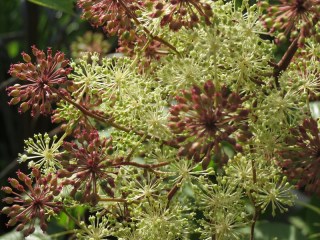 | Aralia cordata flowers catching the sunlight on the Edulis Nursery stand |