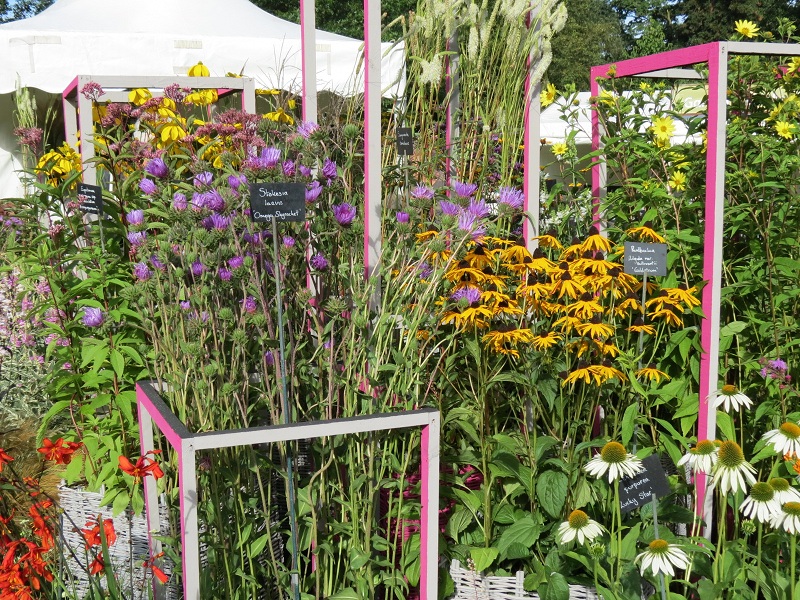 | I rather liked the funky pink frames used to set off the plants on Bean Place Nursery’s stand |