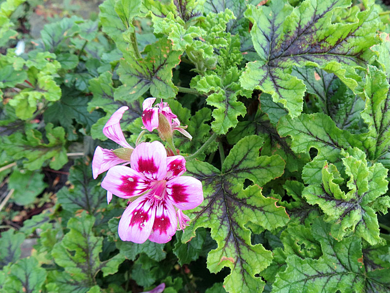 My collection of scented-leaved pelargoniums is kept in the herb garden: I’m particularly fond of this oak-leafed pelargonium, Pelargonium quercifolium, which smells sweetly of woodland floor when you rub the leaves. No frost yet, but these are coming in to the greenhouse very soon.