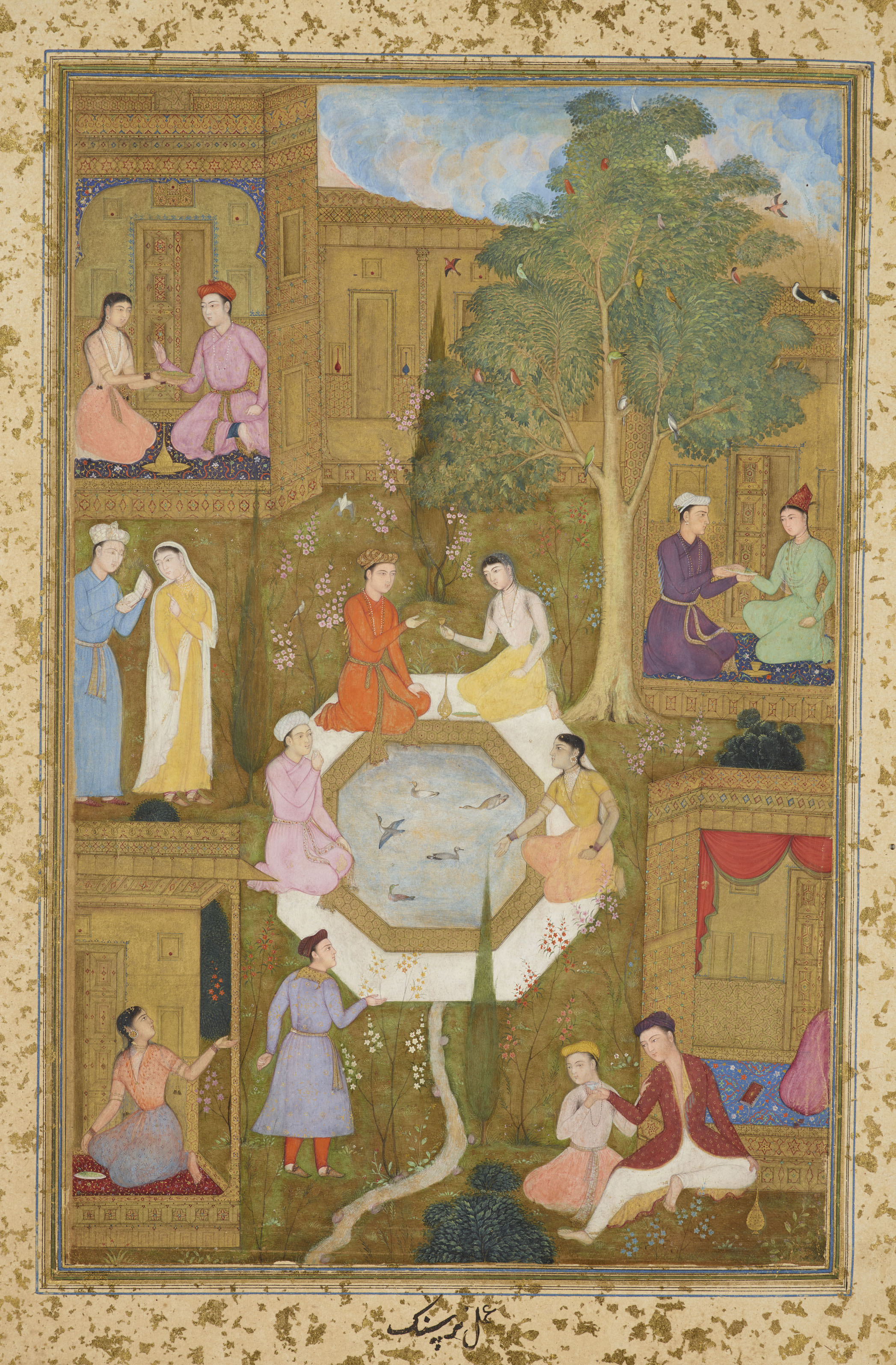Mir ‘Ali Shir Nava’i (d. 1501), Khamsa (Quintet) of Nava’i, 1492. Manuscript on gold sprinkled paper, written in superb nasta’liq script, with elegant illuminations at the beginning of each poem, and six miniature paintings. | 34.4 x 23.0 cm (book measurement (conservation)) | RCIN 1005032. Royal Collection Trust/© Her Majesty Queen Elizabeth II 2014
