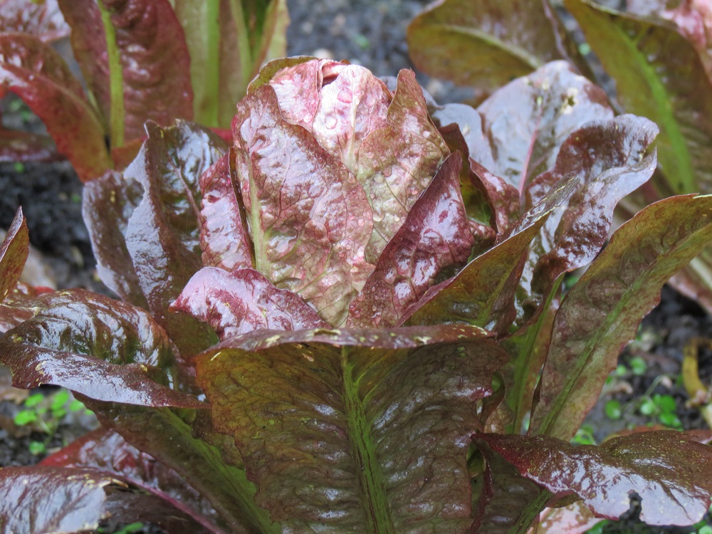 Even better: like many red lettuces, the slugs really don’t like them much. There’s the odd experimental munch from an outside leaf or two, but not a single slimy surprise inside. So lovely just to be able to quarter a lettuce picked from outdoors without having to dissect it leaf by leaf to check for unwanted passengers.