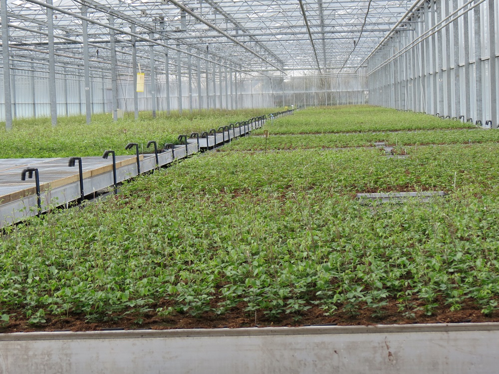 Once the stock plants (in the photo above) have begun putting out serious growth in spring, they’re given a haircut by something similar to a huge horizontal hedgecutter hanging off bars across the greenhouse roof. This slices off the top 15cm or so, ready to be turned into cuttings by rows of ladies wielding very sharp razorblades.