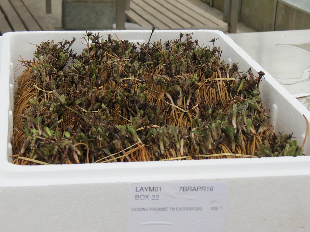 And here’s the finished product, passed as pest- and disease-free, 600 in a box, and in this case off to North Caroline in the US to be potted up and grown on before sale. They don’t look much like clematis at the moment: but give them a year and they’ll be smothered in flowers and looking a million dollars. Amazing.