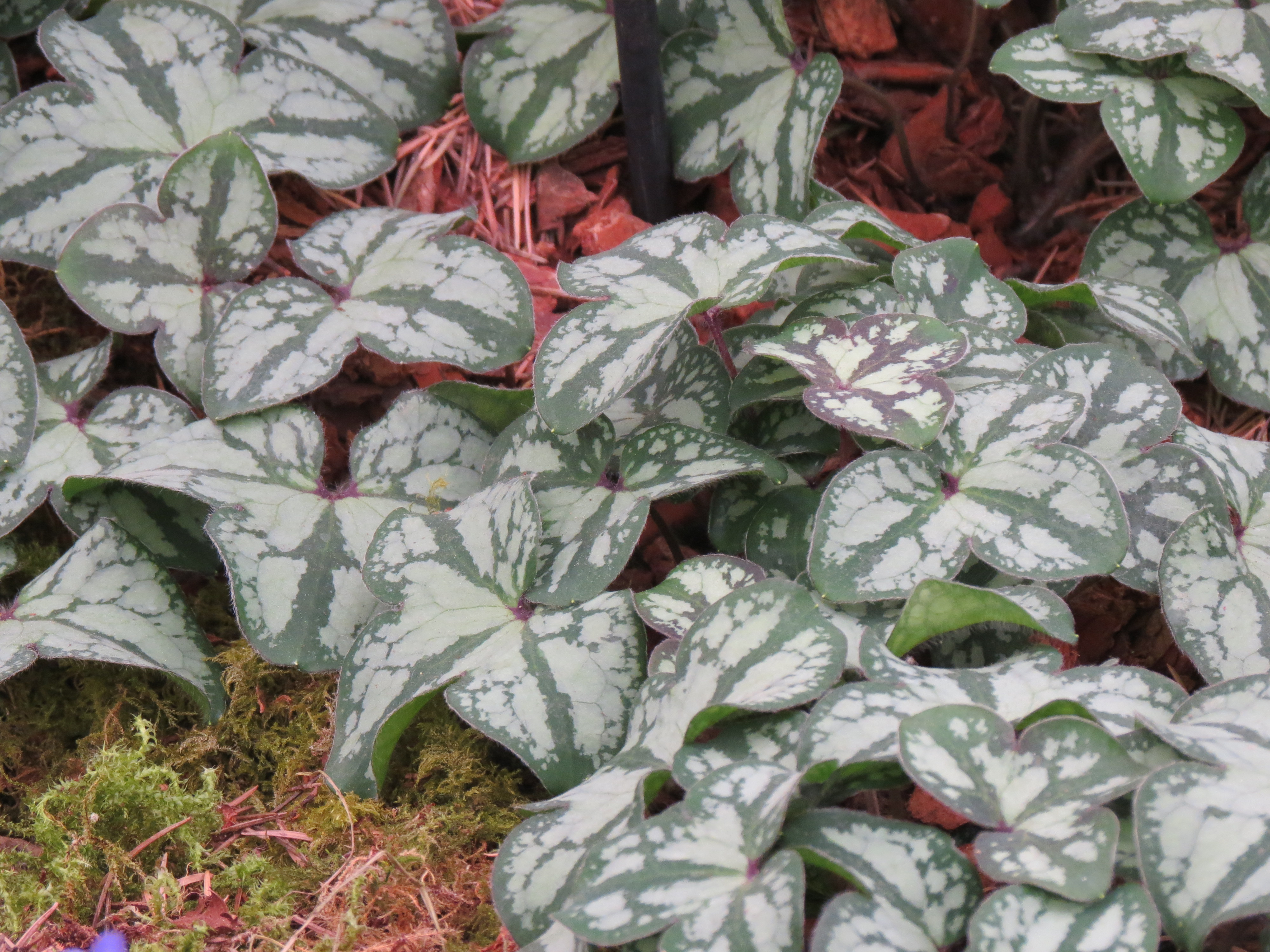 John has been working on developing interspecies hybrids, aiming at plentiful flowers but also bringing out the beauties of the foliage: I hadn’t realised hepatica leaves were quite so lovely. They are three-cornered, like a tricorn hat, and come in attractive variegations reminding me a little of the leaf patterning on cyclamen.