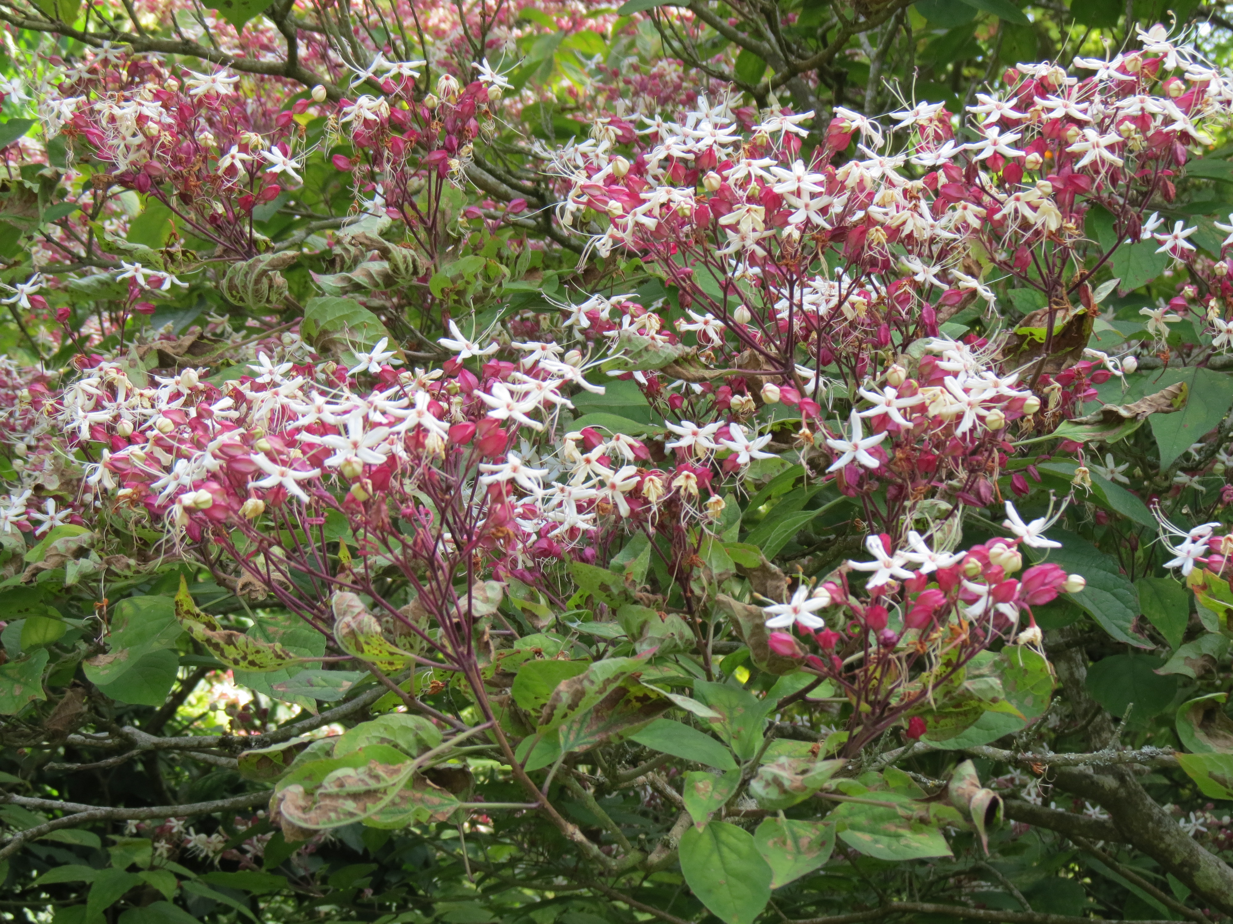 Anyway, down in the bottom of the valley was a sea of little trees, each smothered in delicate white blossoms set off to perfection by cerise-pink sepals. The scent was intoxicating: it filled the air with a sweet, almost lilac-like perfume, heady and exhilarating. I had no idea what it was, so went off to find an obliging gardener (of which there are many at Highdown). And she informed me it was a Clerodendron.