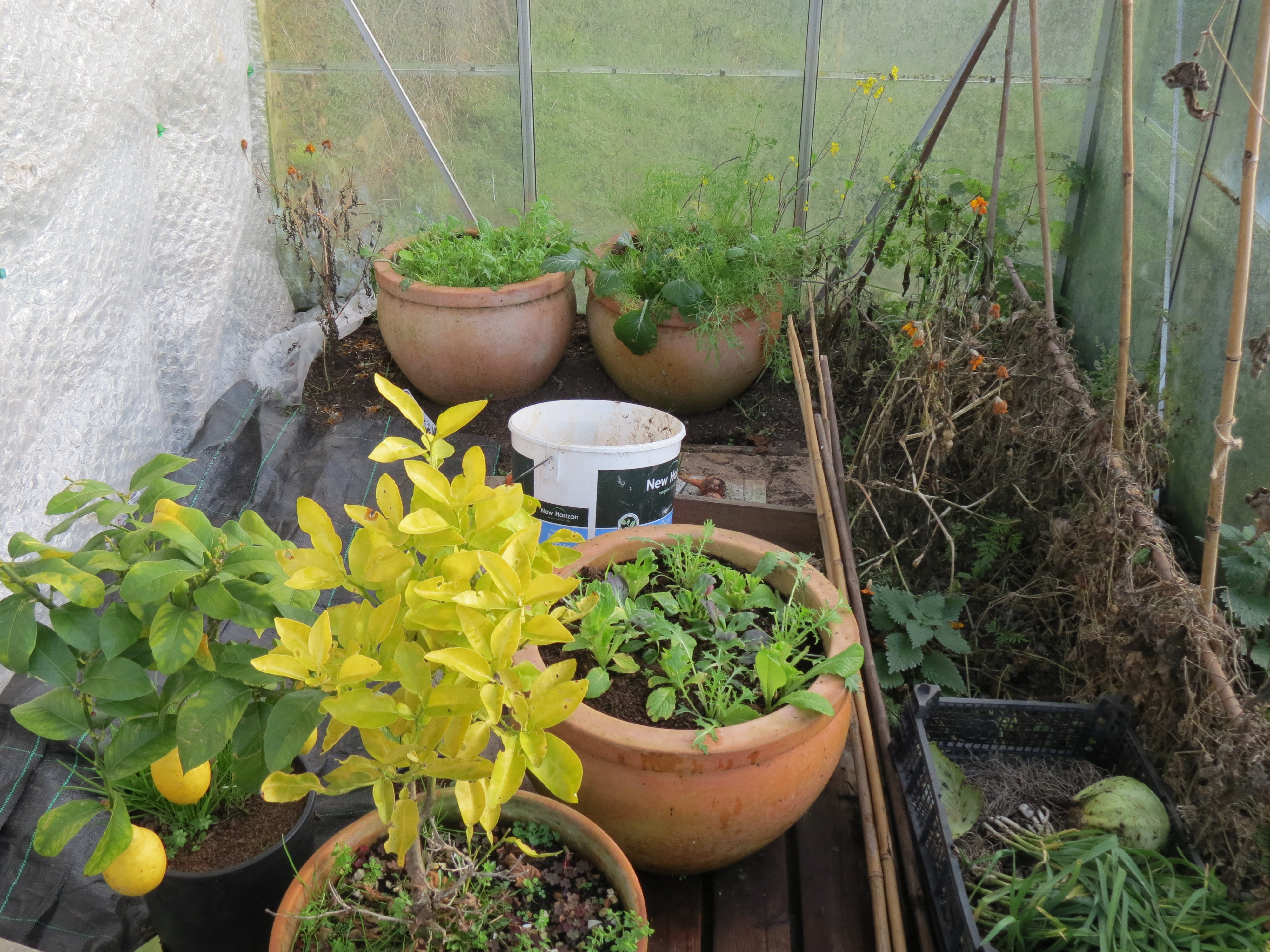 I brought my three-pot salad system in here this autumn too: the extra shelter has kept them growing and I’ve had salads to pick since October.