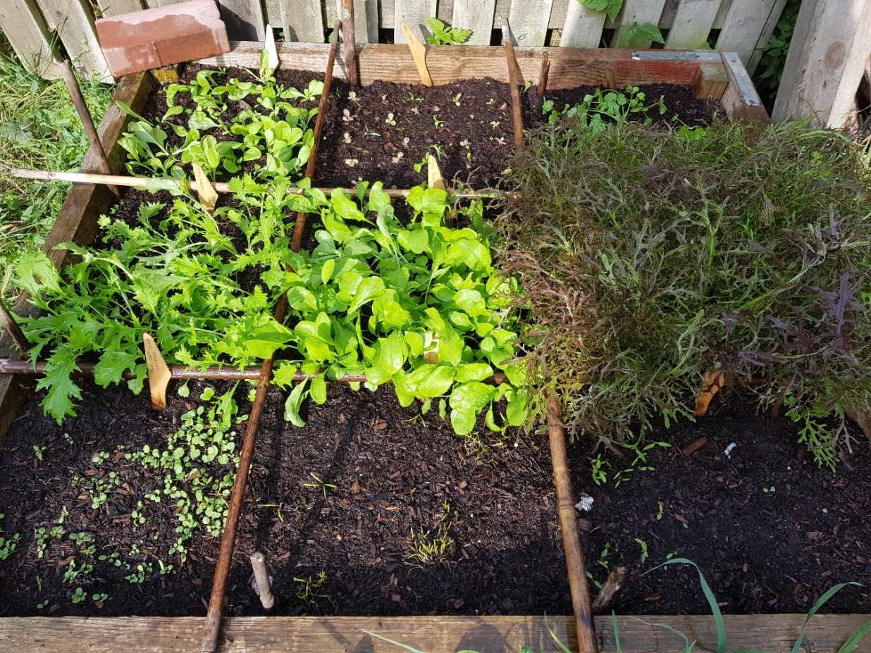 The trick is to make sure it stays damp, feed with high-nitrogen home-made nettle feed weekly in summer and perhaps fortnightly in winter, and harvest regularly: you should get 2-3 cuts from each square before it’s finished (for lettuce, harvest leaf by leaf). Then when you’ve finally picked the last from each square – I’ll probably be picking this lot till early spring before it’s spent – clear the square, add a few handfuls of home-made garden compost like a mulch, and resow each square straight away to keep the crops coming.